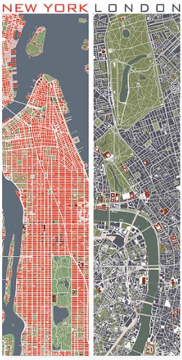 New York ve Londra’nın şehir haritasının örneklerini aşağıya koydum.