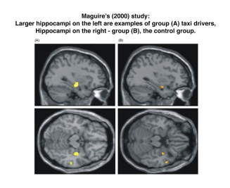 Dikkat ederseniz, soldaki MR’larda sarı renkle görülen hipokampüs, yani Londra’da taksicilik yapan bir taksicinin hipokampüsü, sağdaki “taksicilik yapmayan” bir insandan daha büyük.
